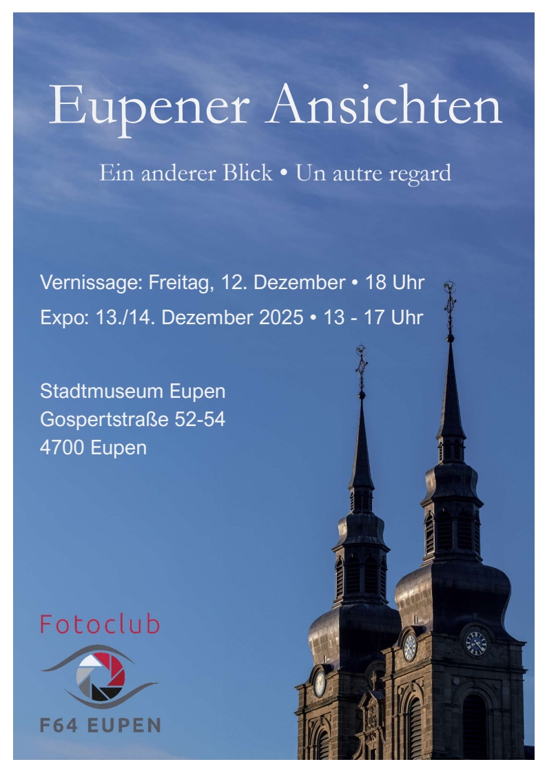 "Eupener Ansichten - Ein anderer Blick": mit diesem Motto präsentiert der Kgl. Fotoclub F64 Eupen am 13.12. und 14.12. - jeweils von 13 bis 17 Uhr - seine diesjährige Winterausstellung im Stadtmuseum Eupen.
